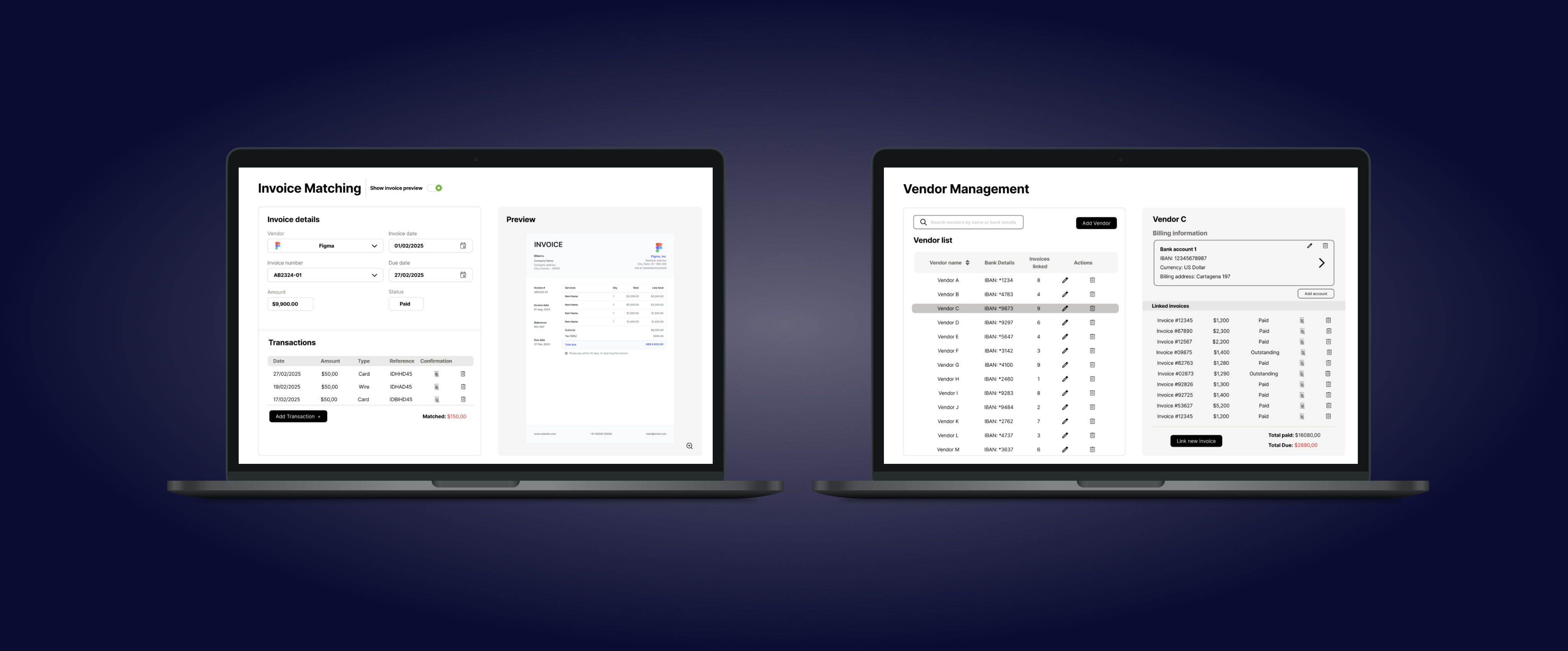 Invoice Matching + Vendor Management redesigned into a clearer internal workflow.